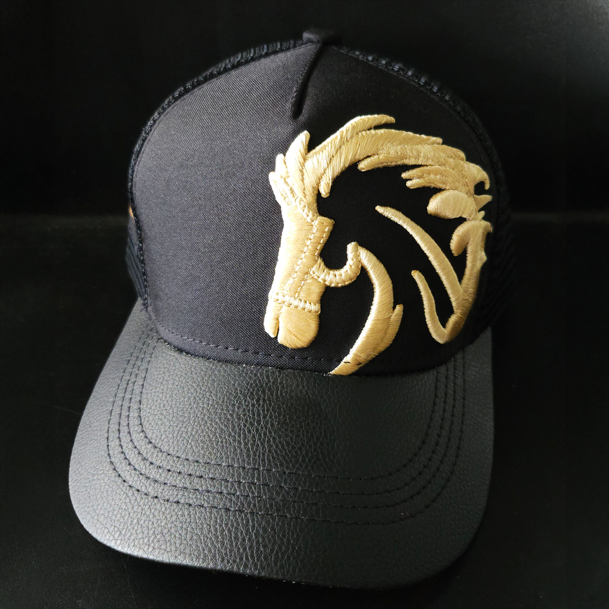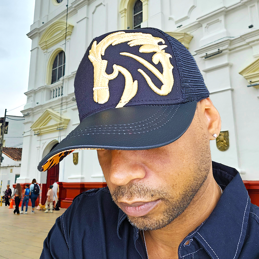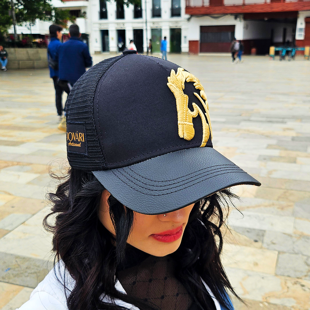 Bovari Artesanal Gorra Premium. Más Fino, Más Salvaje. Estilo Trucker (Snapback). Primera edición de la serie Depredador. Visera de cuerina negra. Corona en lino negro. Bordado dorado. Malla negra. Talla única. *Edición Limitada*