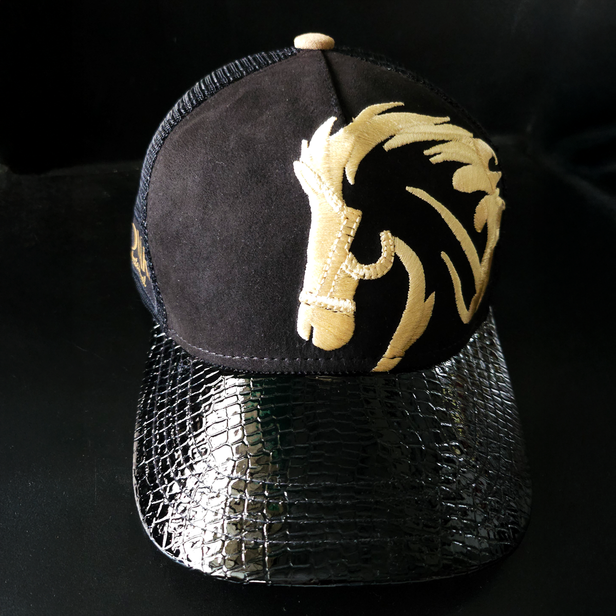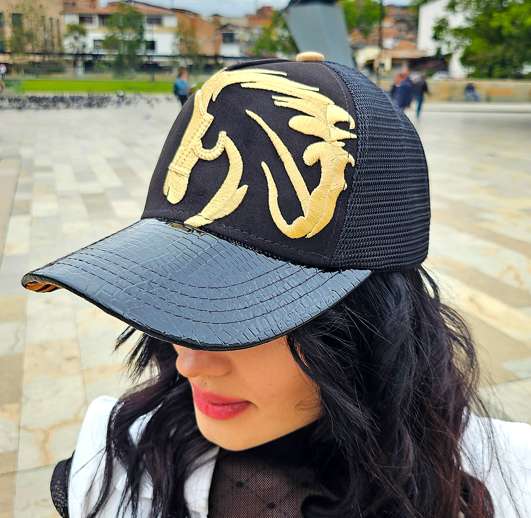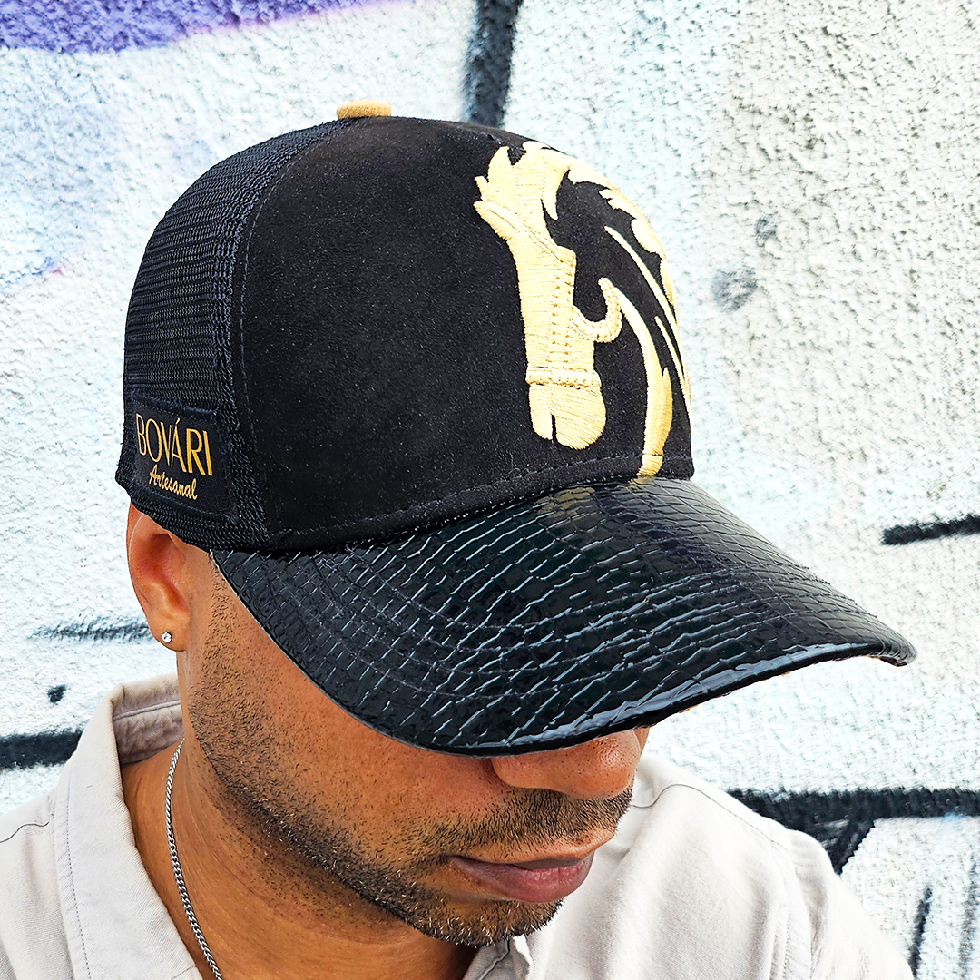 Bovari Artesanal Gorra Premium. Más Fino, Más Salvaje. Estilo Trucker (Snapback). Primera edición de la serie Veneno. Visera en cuerina negra. Corona en lince negro. Bordado Mustang en dorado. Malla negra. Talla única. *Edición Limitada*